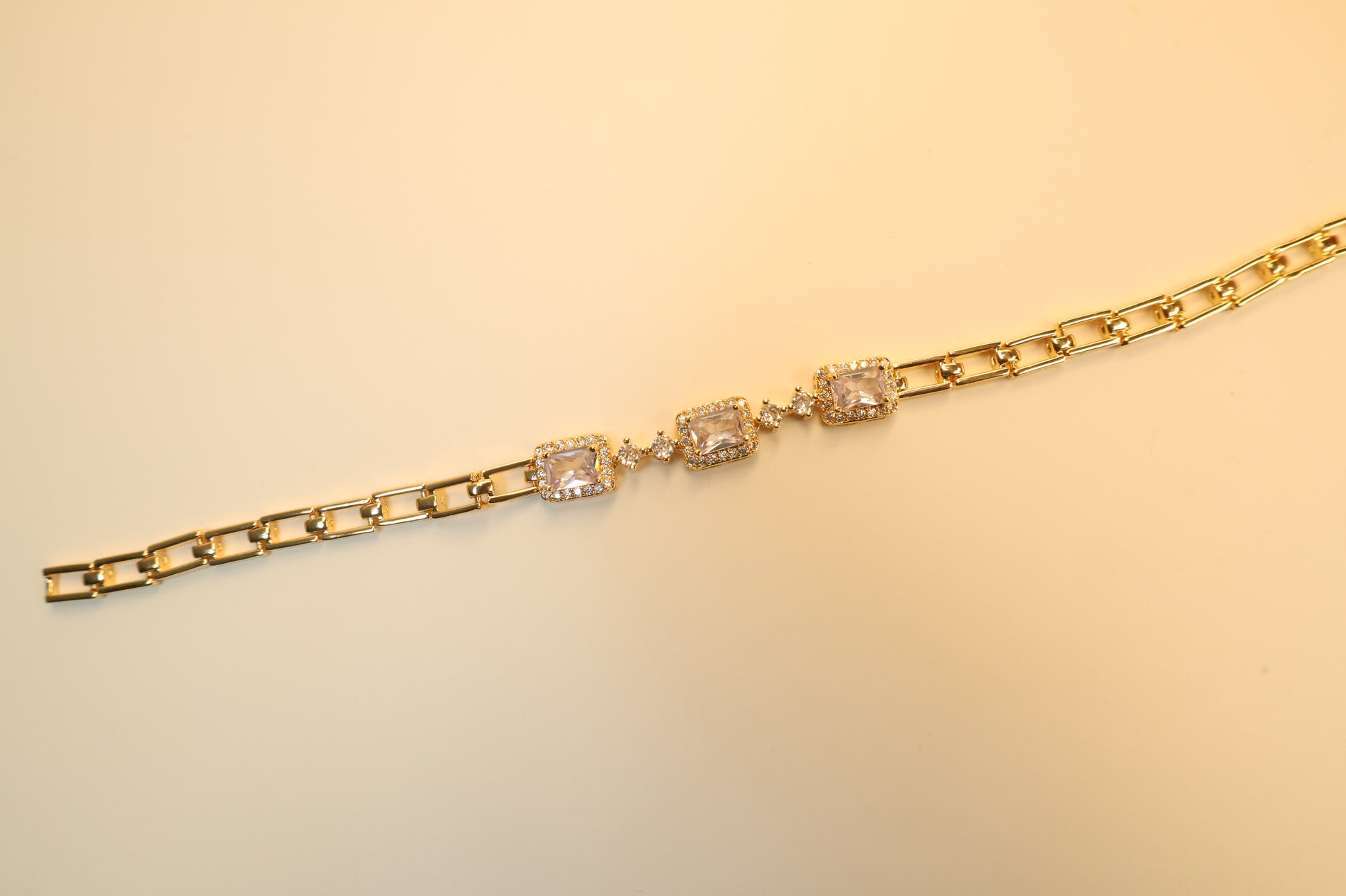 A modern statement bracelet combining bold, rectangular chain links with three dazzling, emerald-cut crystal focal points.