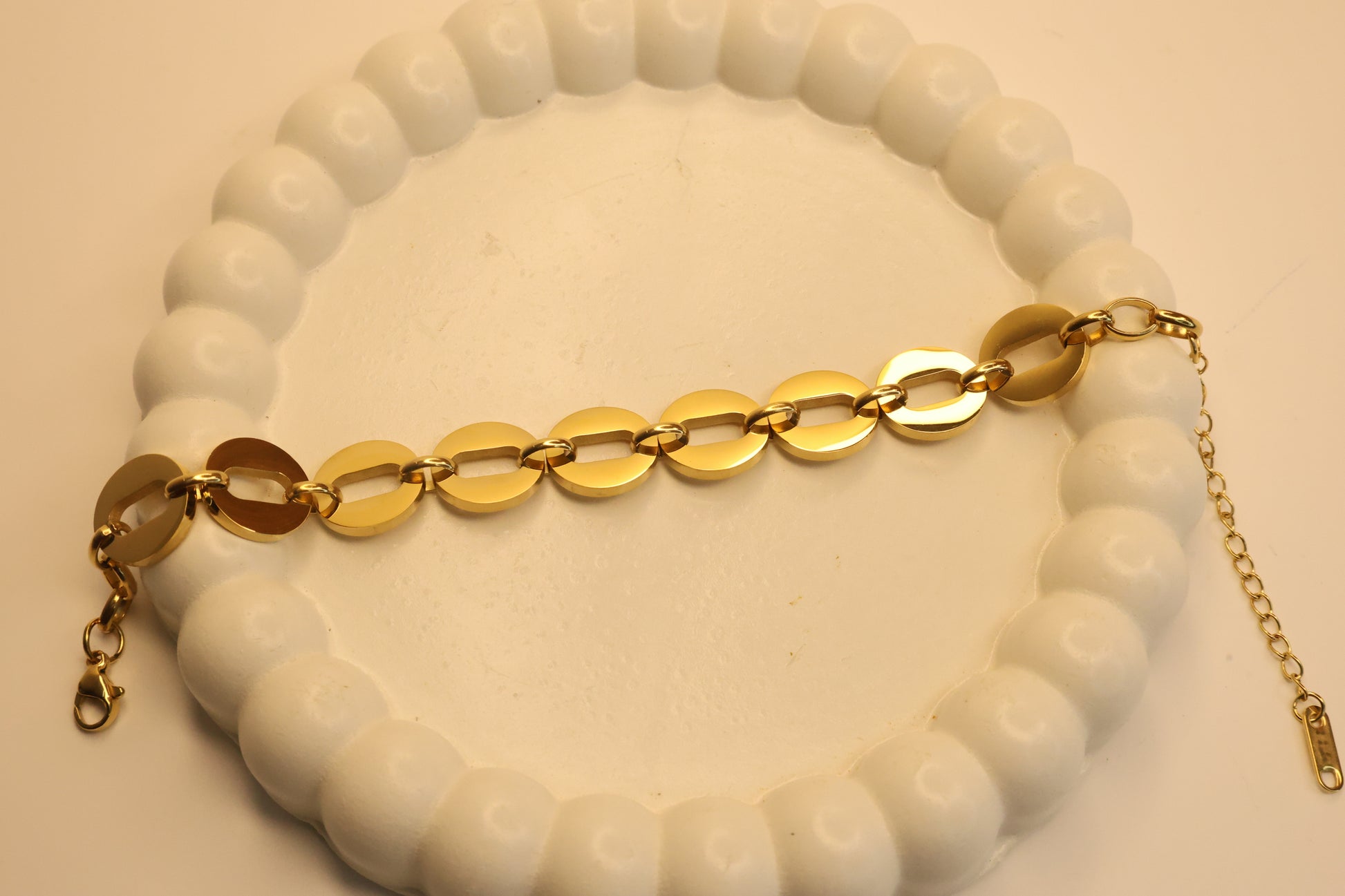 Step into contemporary elegance with The Aura Disc Chain, a bracelet designed for the woman who appreciates clean lines and bold statements. This unique piece showcases a series of perfectly formed, flat disc links that interlock seamlessly, creating a continuous, sculptural band of luminous gold. More than just a chain, it's a piece of wearable art that captures light with every movement, creating a captivating Aura of modern sophistication around your wrist.