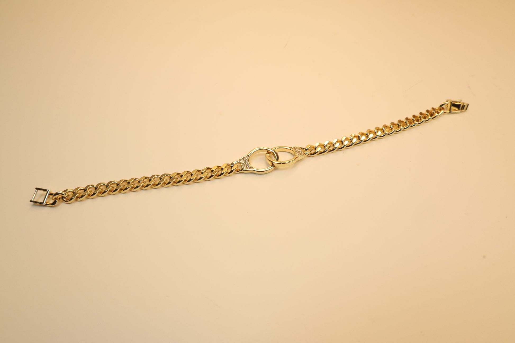 The Aura Interlock Chain is a symbol of two worlds merging: the timeless strength of the classic curb chain meeting the delicate brilliance of the Aura. The central feature—two beautifully intertwined rings—represents unity and lasting connection. One link remains polished gold, while the other is fully paved with sparkling crystals, offering the perfect blend of texture and light. This bracelet is designed to be a significant piece, reminding you of the essential bonds in your life while adding an effortless, elevated polish to your wrist.