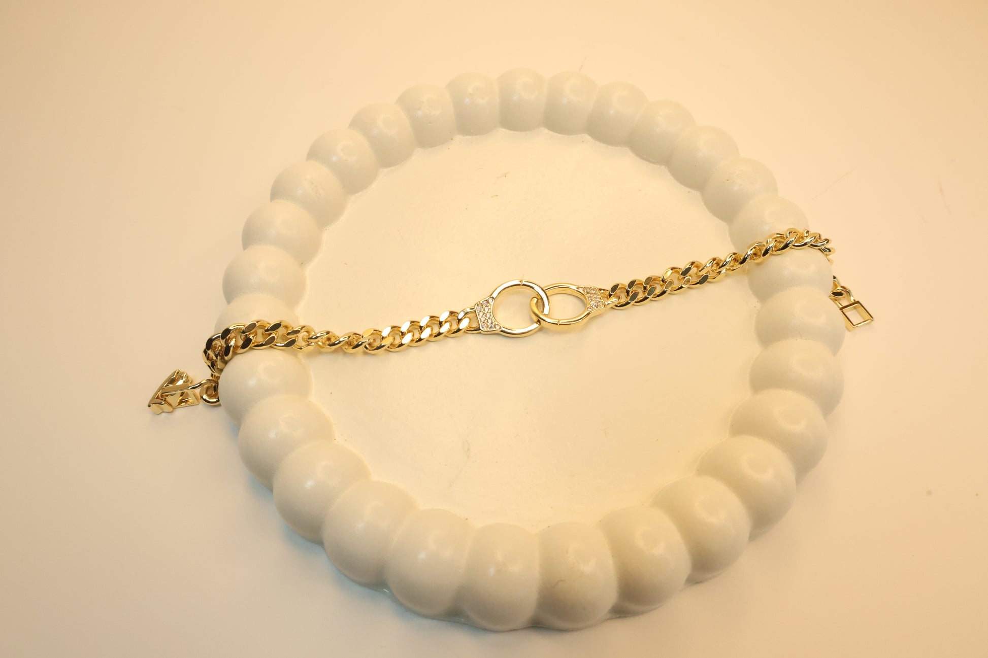 A modern classic: A bold, gold-toned curb chain centered by two interlocking rings, one delicately paved with crystals.