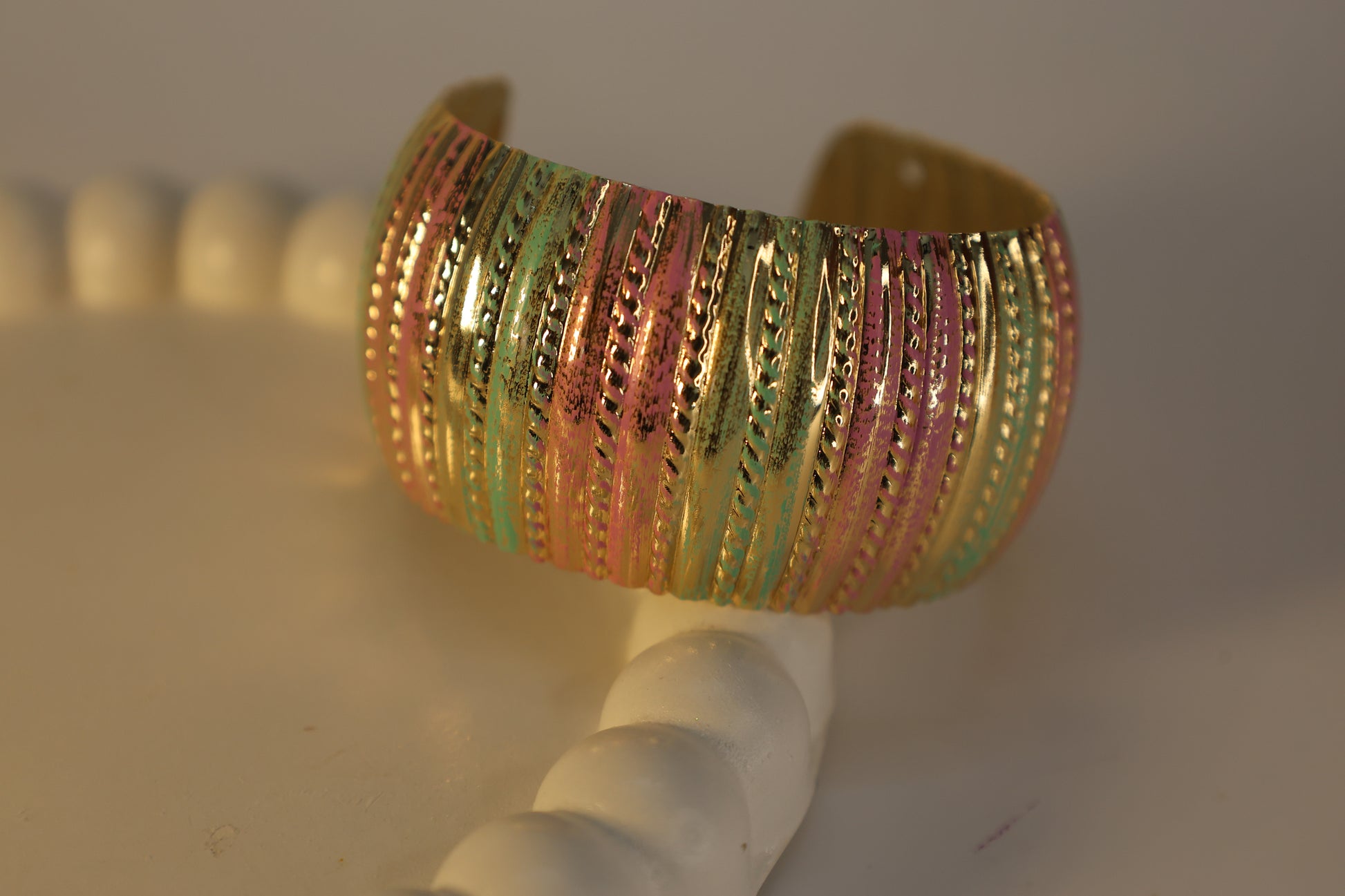 Striking Color Palette: Features a lively mix of vibrant pink and fresh green/teal colors nestled between high-shine gold ridges.
