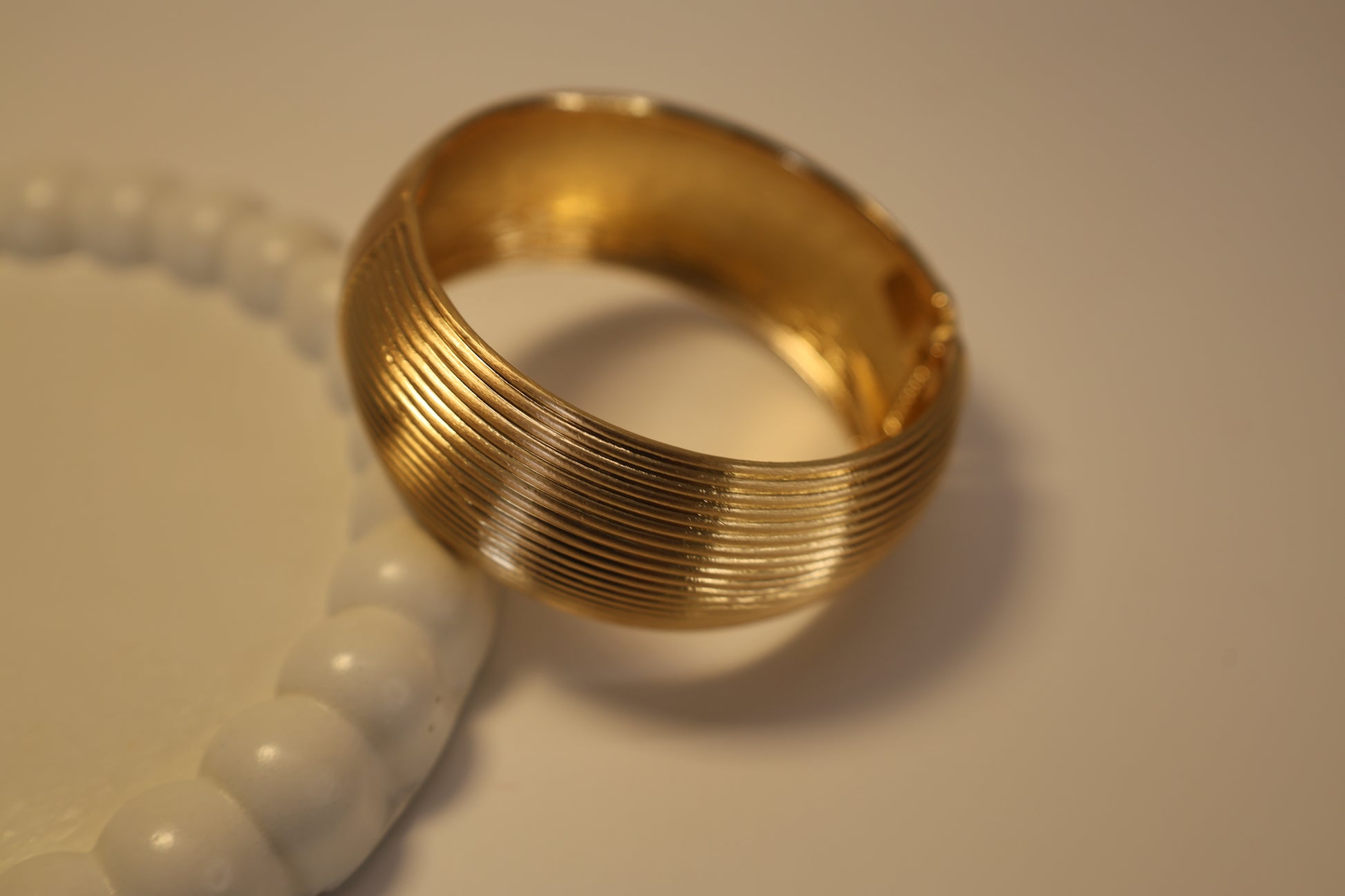 Dimensional Shine: The rhythmic ribbing allows the gold-tone finish to catch light from multiple angles, resulting in a complex, layered brilliance that is incredibly striking.