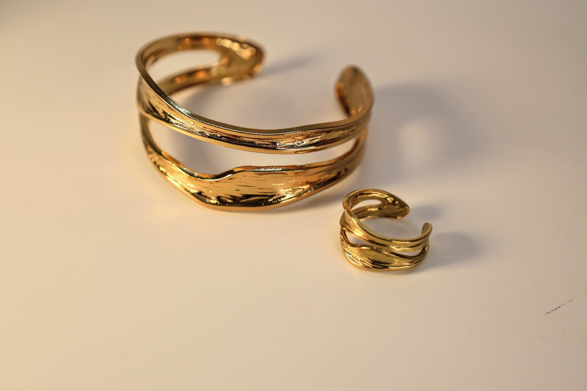 Harness the raw, captivating energy of the sea with The Riptide Set. This matching cuff and ring are not polished smooth; they are forged with a dramatic, molten texture that mimics the chaotic beauty of churning water. Two parallel, open bands twist and flow around the wrist and finger, giving the illusion of liquid gold caught mid-wave.