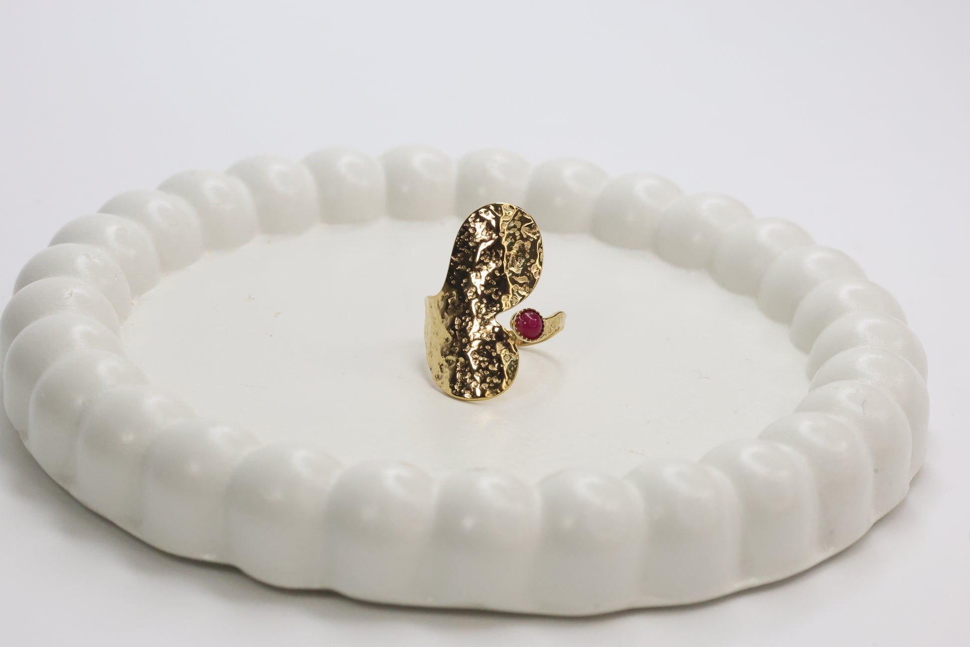 Inspired by nature's bold asymmetry and rendered in stunning detail, The Ruby Leaf Ring is a true statement piece. This wide-band ring features a dramatic, organic shape reminiscent of a sweeping gilded leaf or a phoenix's wing. The entire surface is richly textured with a unique, hammered finish that catches the light beautifully, giving it a luxurious, molten gold appearance.
