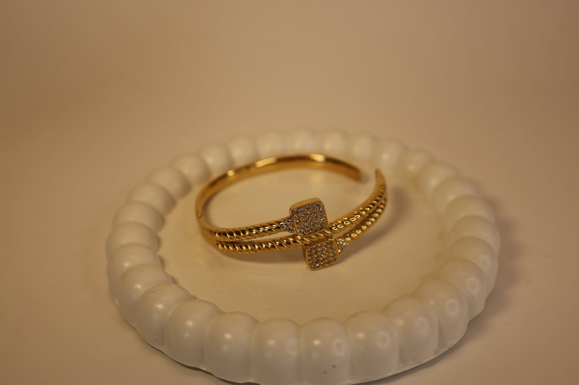 Define your wrist with the luxurious texture and brilliant sparkle of The Trinity Knot Cuff. This stunning piece is an ode to modern sophistication, featuring an open-cuff design built from two exquisitely twisted gold-tone strands. At the center, the 'knot' is formed by two mirrored, diamond-encrusted (pave) squares that meet, creating a mesmerizing focal point. Bold, beautiful, and utterly unforgettable, this cuff is designed to be the highlight of your jewelry collection.