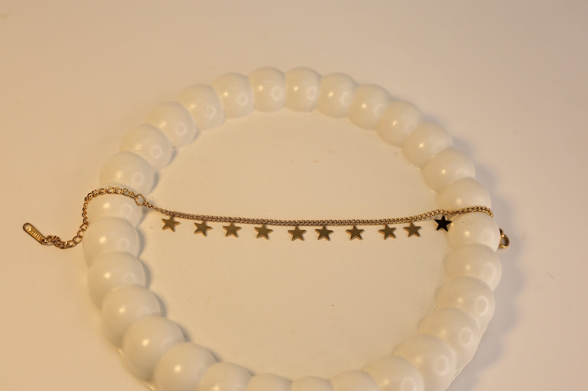 Add a continuous cascade of brilliance to your wrist with The Twinkle Row Bracelet. This captivating piece features a delicate, fine-link gold-tone chain hosting a perfectly aligned row of small, highly polished star charms. Each charm is expertly suspended, allowing it to move and catch the light, creating a dynamic, subtle "twinkle" effect. It's the ultimate everyday essential for those who love delicate jewelry with maximum visual impact.